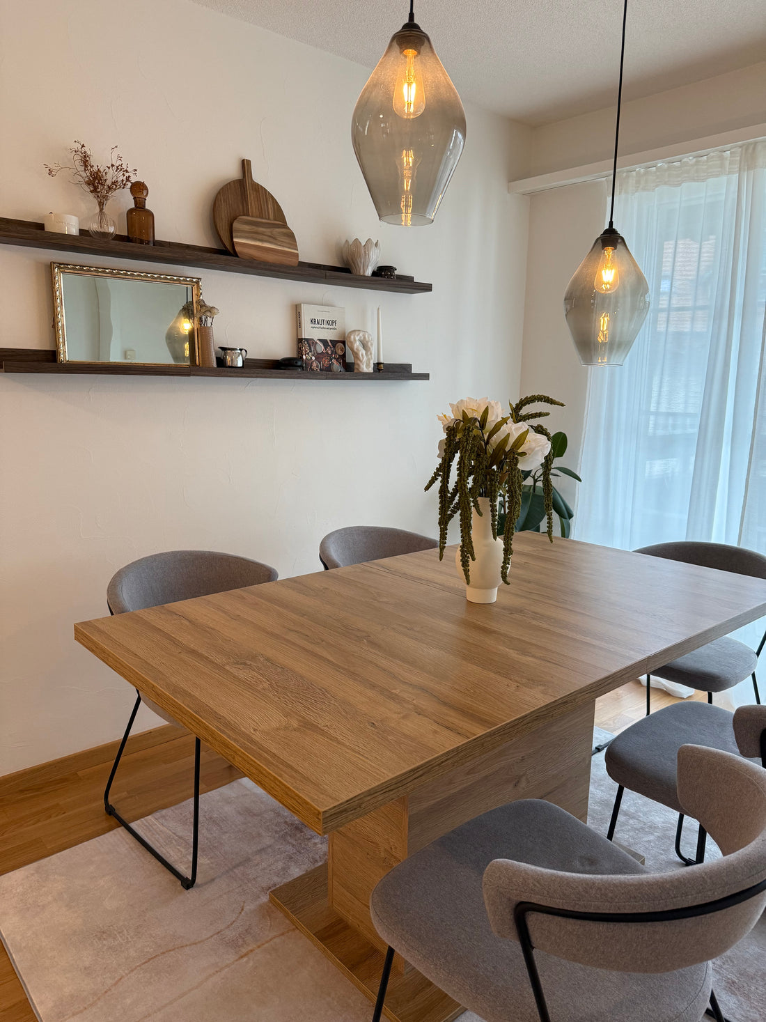 Paket 1: Die Wand hinter dem Esstisch wurde bewusst neu gestaltet, um dem Essbereich mehr Wärme, Atmosphäre und eine einladende Ausstrahlung zu verleihen.