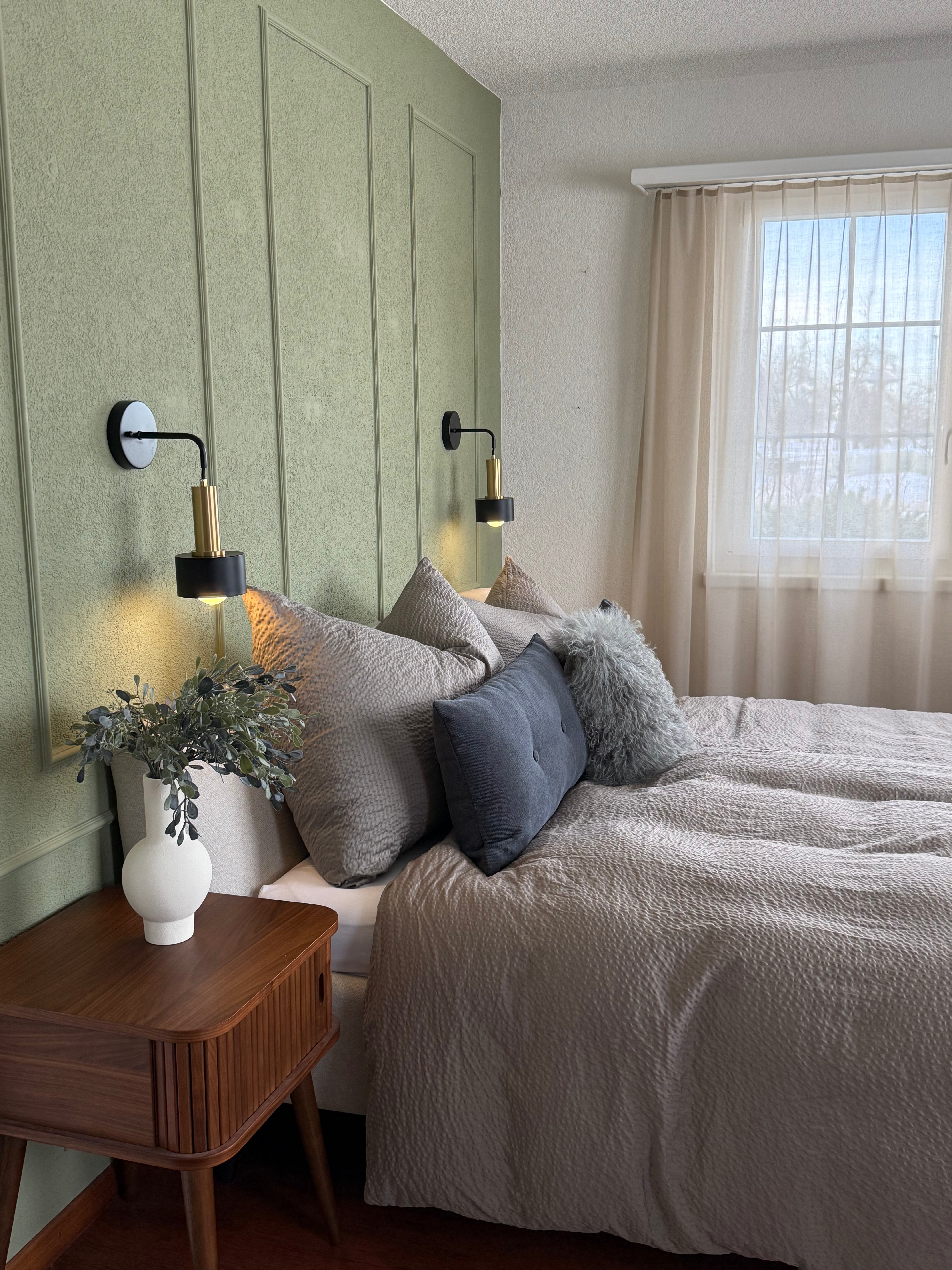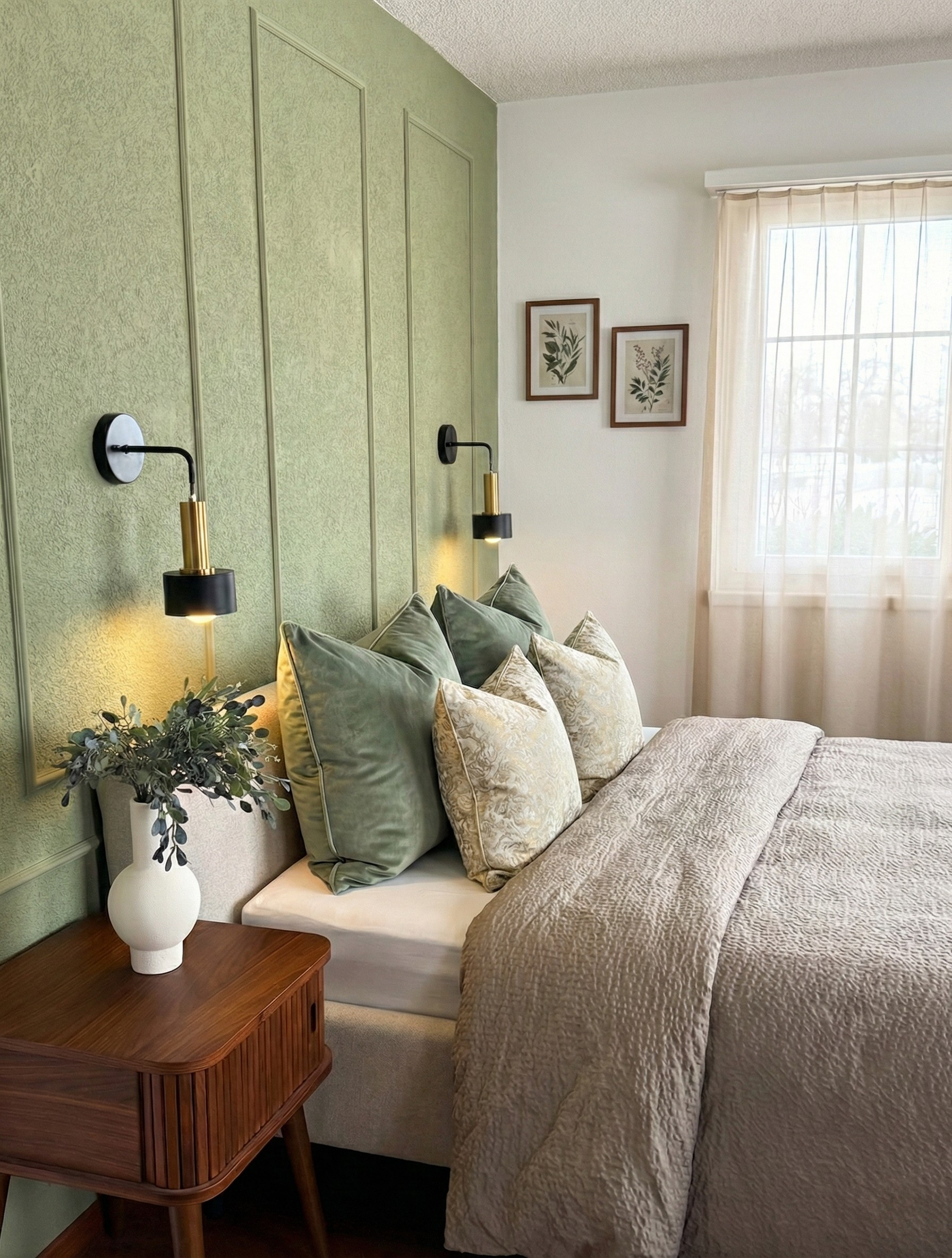 Auch die Bettseite wurde gezielt neu inszeniert und mit bewusst ausgewählten dekorativen Akzenten aufgewertet. Durch die grün gestrichene Wand erhielt der Bereich mehr Tiefe, Wärme und eine ruhige, einladende Ausstrahlung.